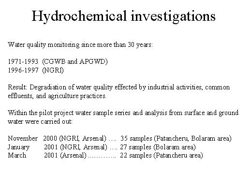 monitoring worked out since more than 30 years. From 1971 to 1993 the activity was followed by Central Ground Water Board, under the Andhra Pradesh Ground Water Department. From 1996 to 1997 studies were carried out by the NGRI. The result of this study was a thick radiation of water quality effected by industrial activities, common effluents and agriculture practices. Within our pilot project we took some sample series and analyses series from surface and ground water. In November 2000 with the NGRI we took 35 samples from the Patancheru and Bolaram area. In January 2001, again with NGRI, we took 27 samples especially from the Bolaram area. Finally, in March 2001 we took 22 samples from the Patancheru area. |