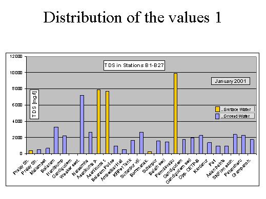 The figure shows the surface water samples in yellow. The concentration of TDS is very high. Also some samples from ground water show high results of TDS concentrations up to 3.000, and one very high to 7.000.