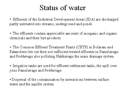 amounts of inorganic and organic chemical and the bye-products. The common effluent treatment plants in Bolaram and Patancheru let out that there are not sufficient treated effluents in Pamulavagu and Peddavagu also polluting Nakkavagu. The irrigation tanks are used for effluent settlement tanks and spill over joins Tamulavagu and Peddavagu. Dispersal of contamination by interactions between surface water and aquifer system is visible. |