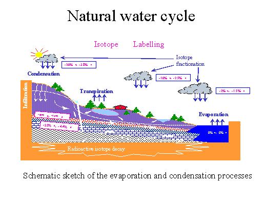 Environmental isotopes are naturally or man-made. In either case, natural processes govern the distribution in the environment and these processes include isotope fragmentation during evaporation and condensation of water. And in the case of radioactive environmental isotopes, radioactive decay during the residence time in the ground water. |