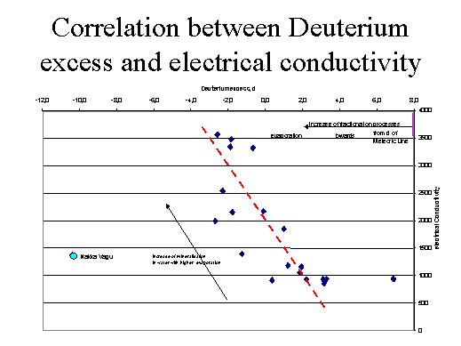 In this diagram the Deuterium excess is correlated with the electric conductivity. One easily can see that with a decreasing minimisation the D-values are decreasing, meaning that they withdraw from the value 8, the D-value of the meteoric line and thus indicating that fractionation processing during evaporation had happened. So you see an increase of the electrical contactivity and increase also of evaporation happened in this ground water, mainly ground water samples. The sample from the Nakkavagu river from the surface run off is off of this line. |