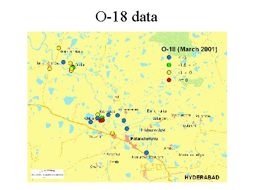 say first fingerprints, of coherences and reasons. I think that from this graphic, one can learn that the well upstream are fed with waters, which are upstream, close to the meteor or to the meteor waterline to the local precipitation line which was not too much under evaporation processes before. Exceptions are only the samples of the surface water, close by the affluent. However downstream in the area of Arutla the majority of the waters is obviously enriched in O-18 caused by evaporation processing in the course of the Nakkavagu river and due to irrigation processes, as I mentioned before. |