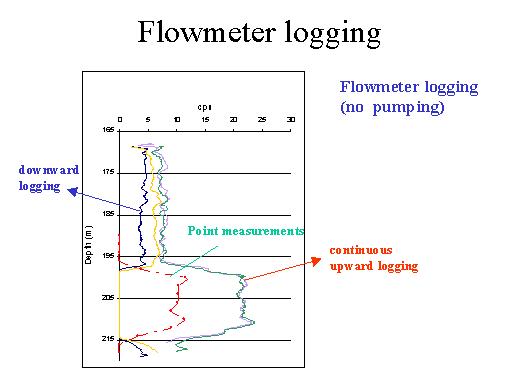 | Here is a result of logging flow meter in a bore-hole: logging can be done under pumping and without pumping. The advantage of logging without pumping is that one can get information about the whole saturated zone. And, of course, you get information, where is the recharge within the saturated zone. |