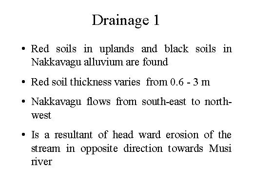 I discuss here about the drainage in the Patancheru area. The red soils in the uplands and black cotton soils in the Nakkavagu are found. The thickness of the red soil varies from 0.6 to 3 meters. Nakkavagu mainly flows from south-east to north-west. This is a result of head ward erosion of the stream in opposite direction towards Musi river. |