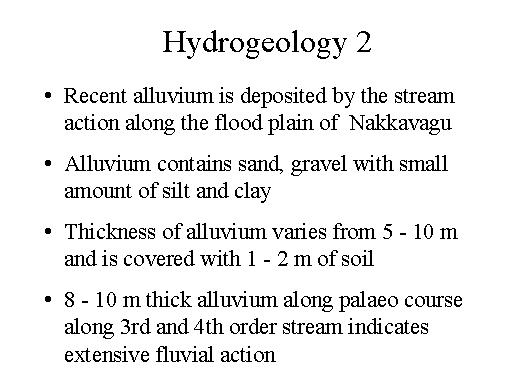 Recent alluvium is deposited there by stream action along the flood plain of Nakkavagu. Alluvium contains sand, gravel with small amount of silt and clay. The thickness of alluvium varies from 5 to 10 meters and is covered with 1/2 meters thick soil. About 8 to 10 meters thick alluvium along the paleo course along 3rd and 4th stream indicates extensive fluvial action. |