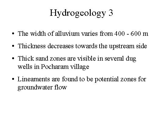 The width of alluvium in the downstream area ranges from 400 to 600 meters. The thickness decreases from a downstream area to the upstream area of Nakkavagu. Thick sand zones are visible in several dug wells in Pocharam village. And also lots of sand mining is being practised around this village. Lineaments are found to be potentials zones for groundwater flow. |