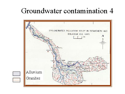 200 meters. So, most of the groundwater contamination is reported along the eastern part of the Nakkavagu. Here you see, between Palumavagu and Peddavagu, lots of alluvial deposits, while the rest of the area is covered by granites, which are indicated as red marks. |
