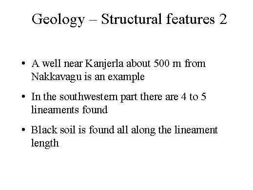 A valley of Kanjerla about 500 meter from Nakkavagu is an example. In the southern part there are 4 to 5 lineaments. Black soil is found all along the lineament length.