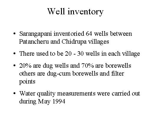 | Sarangapani inventoried 64 wells during 1994, which gives a historical data in this area. There used to be 20-30 wells in use during that time, and most of them, over 80% of them covered as dug wells, and 70% are borewells, others are dug-cum borewells or filter points. These measurements were carried out during May 1994. |