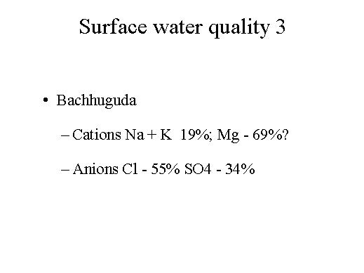 In Bachhuguda the Cautions concentration is Sodium plus Potassium is about 19% and Magnesium is found to be very high level over 69%. The reasons for Magnesium are not found. Among the Anions the Chloride concentration is about 52%, Sulphates are about 34%. |