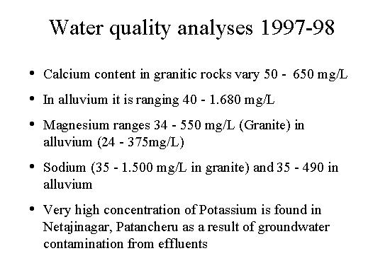 per litre in the alluvium. Magnesium concentrations varied from 34 to 550 milligrams per litre in the granites, whereas in the alluvium it about 24 to 375 milligrams per litre. Sodium concentrations were found to be in the range of 35 to 1.500 milligrams per litre in the granites, whereas it was in the lower concentration of 34 to 490 milligrams per litre in the alluvium. Very high concentration of Potassium is found in Netaji Nagar, eastern part of Patancheru, industrial estate as a result of groundwater contamination from the effluents. |