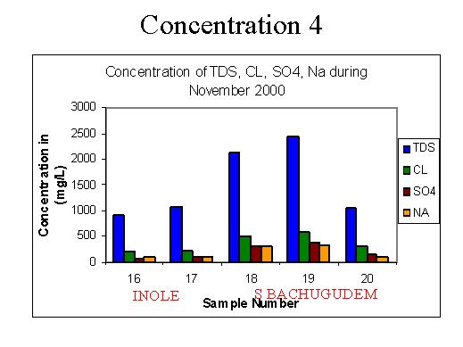 And analogously the TDS concentration is about 1.000 milligrams per litre and the Chloride concentration is less than 200 milligramms per litre. At Bachuguden you can see the TDS concentration of the surface affluent is about 2.100 milligramms per litre and the Chlorides is about 500 milligramms per litre and Sulphates is about 350 milligramms per litre and Sodium also are of the same order. The groundwater samples nearby have also shown a similar concentration of Chlorides and Sulphates. |
