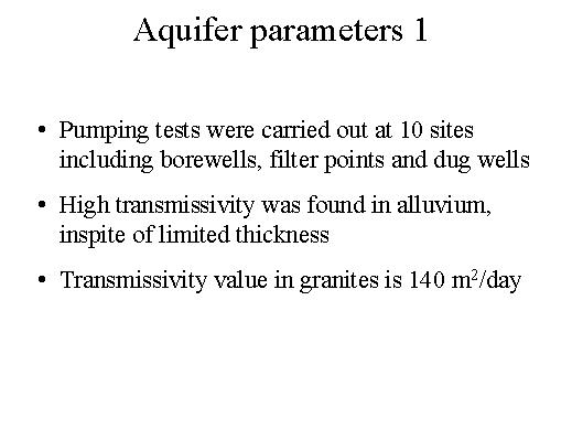 The aquifer parameters estimated from the field are ranging from 140 meters square per day in the granites to about 1.300 meters square per day in the alluvium. The parameters are used in the groundwater flow model.