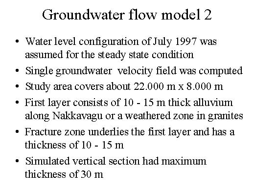 configuration on July 1997 was assumed for the steady state condition. So a single groundwater velocity field was computed and the entire study-area covers about 22 kilometres by 8 kilometres and the first layer thickness is 10 to 15 meters and along Nakkavagu or a weathered zone and the granites. The fractured zone underlies the first layer and has a thickness of 10 to 15 meters. The two total thickness of this meter vertical section is maximum of about 30 meters. |