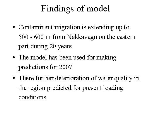part during the last 20 years. The model has been used for making predictions for 2007. There is further deterioration of water quality in the region was predicted for the present loading conditions. The groundwater modelling studies indicate the contaminant migration is extending up to 500-600 meters on the eastern part of Nakkavagu if the present loading is continued for the next 20 years. Now the government under the Andhra Pradesh Pollution Control Board is imposing restrictions on the common effluent treatment plant in the far discharging there waste water in the Nakkvagu. The present study also confirms the findings from groundwater and the NGRI studies, where the trace elements like Arsenics, Selenium, Strontium were still available in groundwater. |