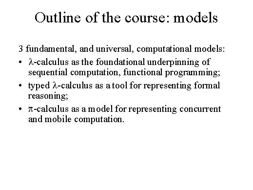 course. First we will discuss models, we will discuss three fundamental and universal computational models. The first as I said is l-calculus, which is the foundational underpinning of sequential computation and functional programming. Then we have typed l-calculus, which is precisely a tool for representing formal reasoning: it is the combination of tight theory with l-calculus. So typed l-calculus is equal to l-calculus plus type theory. And then we have the p-calculus: this is a model for representing concurrent and mobile computation. |