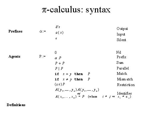 the channel n a a name. This is perform an internal action. And here you have all your agents: the nil agent, the agent which makes an action and then turns into P, the not-deterministic sum, the parallel sum to operators for branching. This is extremely interesting, this is the restriction operator, this is a construction which makes the name x private to P, so here knew the notes a binding operator. So this is a binding operator and that is a binding operator. So, you see, in the l-calculus you have just one binding operator l. Here you have in the p-calculus two binding operators: new and this. |
