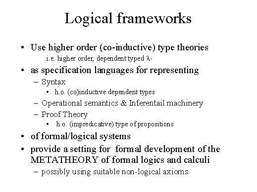 The first is logical frameworks, and it is based on constructive higher