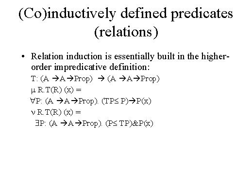 and relation co-induction. This is essentially the different nature with respect to the previous one, because this essentially the kind of induction that goes on in relation induction simply stams from the inductive definition of a given predicate. If this predicate is a minimal fix point, like if you want to describe a transition relation, or a maximal fix point, that is if you want to describe an observation relation, here you have realise an induction and co-induction principle. So, as you see, these two inductive principles are nearely the logical expansion of the very definition of the predicates. |