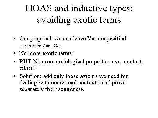 | So, our proposal is, we can leave Var unspecified and no more exotic terms. Of course now, deriving meta-logical properties of a context is very difficult. And now a solution is to add axioms which describe essentially only what is strictly necessary for reasoning on context, and we have distilled these axioms form a very large case study precisely on proving meta-theoretical properties of the p-calculus. |