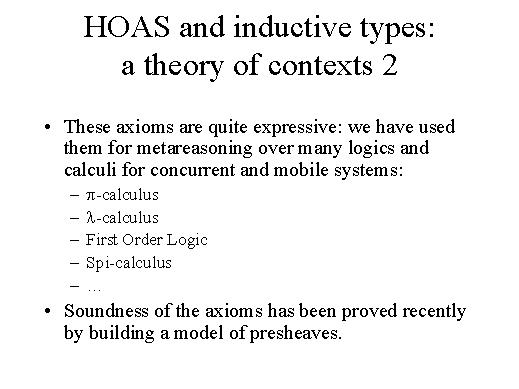 | Now, it is remarkable that with these simple axioms we did derive the meta-theory of all these object calculi, thus proving that a higher order constructive type theory which uses higher order abstract syntax together with a suitable collection of axioms can be a very successful metamodel. |