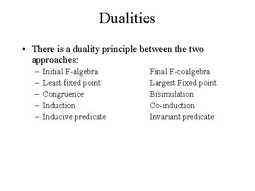 | There are dualities between the two approaches. We have initial algebras final co-algebras. Least fix points are essentially a set theoretic counterpart initial algebras, and this side we have largest. The concept of congruence gives rise to a certain bisimulation. Induction to co-induction, inductive predicate to invariant predicate. |