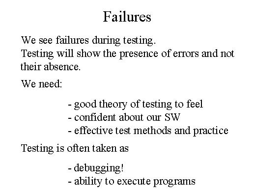 We will see the failures during testing. Testing will show the presence of errors, not their absence. We need good theory of testing to feel confident about our software, this is one of the requirements. We also need effective test methods and practices to enable us to locate the faults and correct them. Testing is often taken as a debugging which is not true. And often we also take it as a ability to execute programs. |