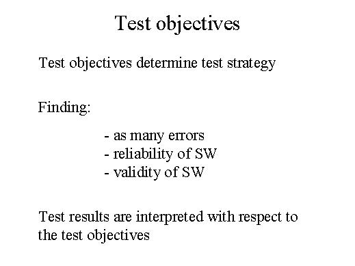 Test objectives determine the testing strategies. Now, let us see what sort of object tools could be there? Someone could say: "I want to find out error, as many errors as possible". And someone says: "I want to see that a software is reliable, what I want is the reliability of the software. Or, is a software valid?". Each of these testing has its own object, so we must really look to what are the objective for our test, so that we could properly design test strategies. |