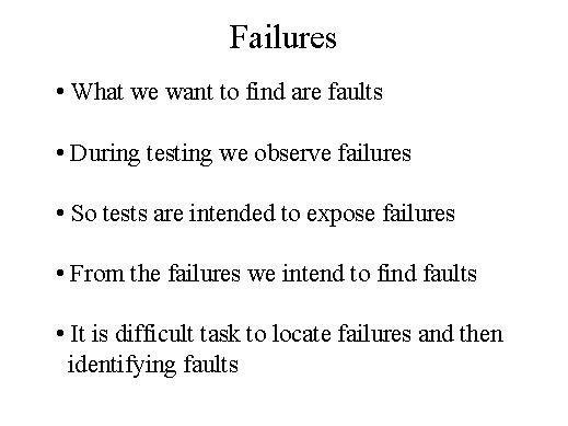 Now, what is our object? What we want do find out are faults. During testing we observe failures not the faults. So, the tests are intended to expose failures. From the failures we intend to find the faults. It is difficult task to look to the failures and then to identify the faults. This becomes very important if know that a failure to the fault it has many to many relationship. Let us look at that. |
