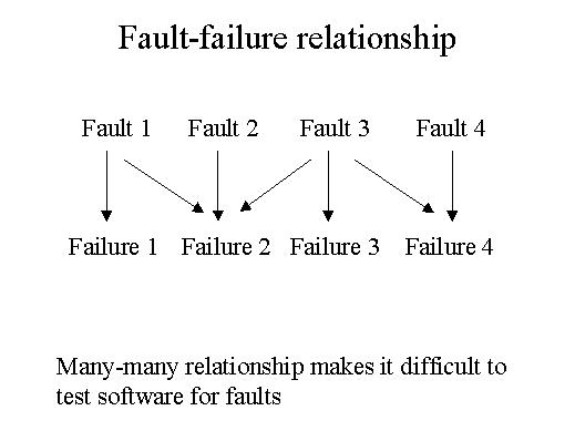 | Now here are sorts of fault-failure relationship. A fault could manifest itself as a variety of failure. In failure 2 are a result of a fault 1, or fault 2 could only result in failure 2. Or fault 3 could result in failure 2, 3, 4. Now, on the other hand the failure 2 could have occurred because of fault 1, of fault 2 or fault 3. This sort of many to many relationships makes it difficult to test a software for faults. |
