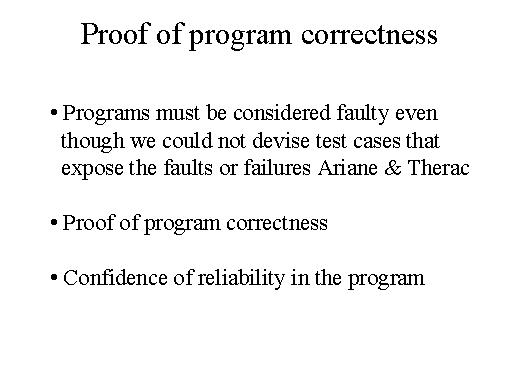 Programs must be considered faulty even though we could not devise test cases that expose faults or failures. It is a typically area the examples. The Therac versions did work for a long time. So the situation has never created a test case, which caused it to fail. So, the fault was not uncovered till almost 1987. It is equally true Ariane. The fault that the acceleration above a certain limit causes a overflow. This particular aspect was not considered in the design and so it has led to a failure. This fault was uncovered only when Ariane 5 failed. |
