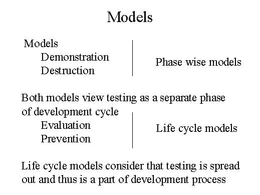 so they are called phase wise models. The other two models, the evaluation model and the prevention model, are the life-cycle models. The process of testing is in the form of evaluation and this will be occurring from the very beginning till the end. The prevention model is a little bit different. It has to prevent. It takes all the steps to ensure that we prevent the faults getting into the program. So, this is what I call life-cycle models, because the prevention is something which will be doing all the cycle, all the phases. |
