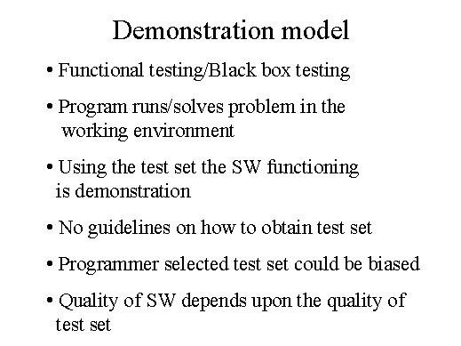 means, it is some sort of a black-box testing, we are looking to. So, here the program, what the programmer does is, he would like to show the program runs during the functional testing. And it solves the required problems in the right working environment. Often the test is taken from the working environment and would ensure the program runs. So, from that point of view it is not a thorough testing. Using the test set the software functioning is a demonstration. There are no guidelines of how to obtain the test set. This is left to the programmer, often the person will be using a domain relevant or test set. One must realise the software does not pay you for use that domain relevant or test sets. But, what we call domain relevant from the environment the no sort of a test set should be useful but sort of a data would be going into the program. And if you try to provide that sort of a data the system is not likely to fail. However, when you try to do certain things beyond those specified norm, specified environments, that is where the problems will be coming. So, I this does not really tell us how to test those things. Programs test select data could be biased, that is another one. Now, finally one must say, quality of the software depends upon the quality of the set, the test set. So, because the programmer for demonstration purposes makes use of a limited test set, the quality is not likely to be very good. |