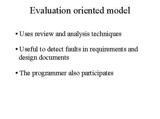 and finally the program. The evaluation oriented models look at using analyses review and analyses techniques, useful to detect faults in requirements and design documents. The programmer also participates in it. However the programmer's role is more advisory. |
