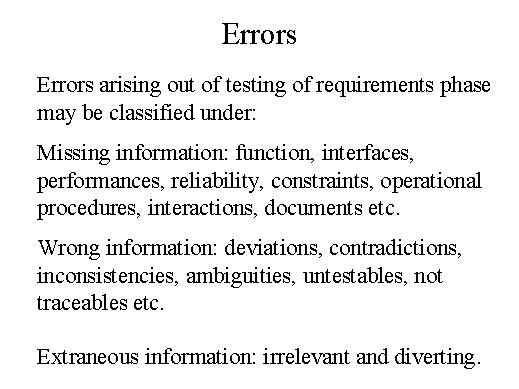The missing information is something like missing function-interfaces, performance reliability, consistence, etc. The wrong information is basically the deviations from the original intentions, contradictions, inconsistencies, ambiguities, untestables, not traceable. It is a wrong information if more than one person is developing the software. The sort of a document that is required to record it is very important. So, while testing also, this has to be recorded and this should be communicated. The extraneous information is something which is going to mislead, so it is better to identify what it is. It is often irrelevant and diverting sort of information. |