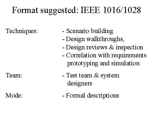 useful in some cases. The team is basically the test team and system designers. And finally we have the formal descriptions. For instance flow diagrams, or data diagrams, these are all the formal descriptions that we have been using all this time. |