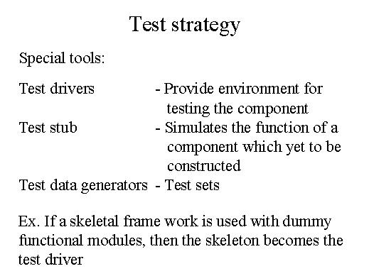 it. So, this could be useful for the top-down testing. Then you have the test data generators. These are automatic test data generators. If a skeletal frame work is used with dummy functional modules, then the skeleton becomes the test driver. |