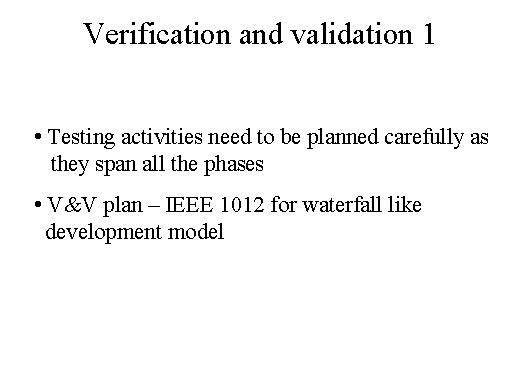Validation, verification, planning and documentation testing have to be planned carefully as they span in all the phases. The verification and validation planning is IEEE 1012.