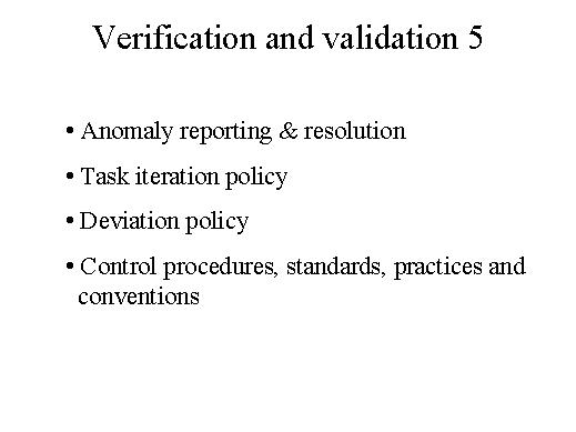 Specially these are of interest: anomaly reporting and resolution, task iteration policy, deviation policy, control procedures, standards practices and conventions.