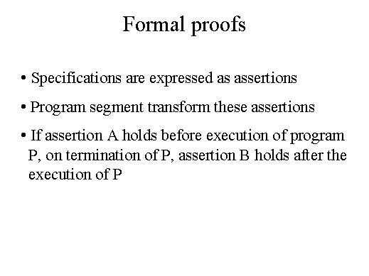 Finally, the specifications are expressed as assertions. The program segment transform these assertions. If the assertion A holds before the execution of the program P, on termination of P, assertion B holds after the execution of P.