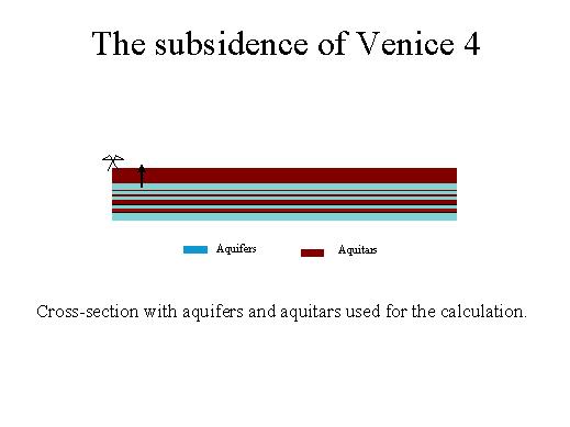 | So here is the schematisation of the cross-section. The symmetry axis is on the left hand side and the arrow shows the limit of the pumping area, which we got from the piezometric surfaces. Then you see in blue the aquifers and in red or brown the aquitars. |