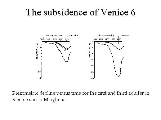 sample have been extracted. We have also had the drawdown in the first, the second, third, fourth, fifth aquifer and we checked for instance, we calibrated our model over the first from the year 1930 to 1970 and where we were able to reproduce the drawdown in the first aquifer close to Venice. You see the dots, the continuum line are the calculation, the dots are the measured values. Then from 1970 we made the predictions. The model has been very well calibrated because the predictions are quite good. |