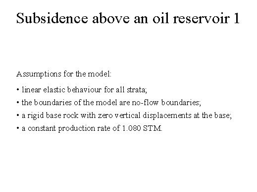 | The next example is the case of subsidence above an oil reservoir. And again here I give the assumption, we assume the linear elastic behaviour for all strata, then the boundaries of the model are no-flow boundaries, in the case of Venice they are open to flow. Then here we have a rigid base rock with zero vertical displacement at the base and a constant production rate of 1.080 standard barrels. |