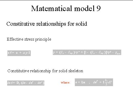 account that absorbed water does not produce any stresses. Then for the effective stress we write a constitutive relationship. Here we have the total strain, we have the thermal strain, which is given here, here we have the thermal expansion coefficient of the solid, and these are strain terms which are not connected with stress changes. |