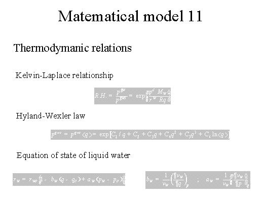 | Then, for the model closure we need thermo-dynamic relationship, we have the Kelvin-Laplace relation, which gives the relationship between vapour pressure and vapour pressure saturation. And the vapour pressure saturation is given here by the Hyland-Wexler law, because we are quite above the normal temperature. |