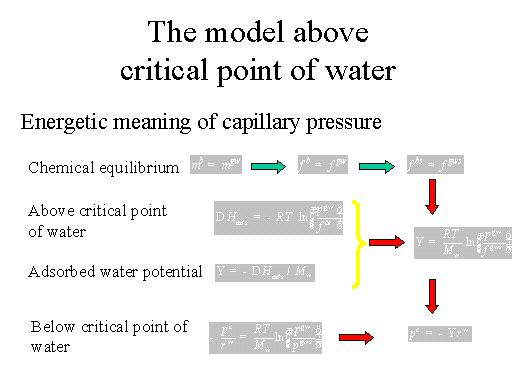 the following assumption. We consider chemical equilibrium, so we have equality of chemical potential at the boundary of the vapour, then we have also equality of the fugacity, the boundary and the vapour, fugacity is equivalent to pressures, and also the equality of the fugacity of saturation. Above the critical point of water the entity of absorption is given by this expression, and the absorbed water potential is given here. If we combine this we obtain this equation, which is very similar to the Kelvin-Laplace's law, below the critical point, we have just to identify. So if we make this identification we can expand the model also beyond the critical point, we can go up to 1.000, to 1.200 degrees centrigrade, which have been measured in tunnel fires for instance. |