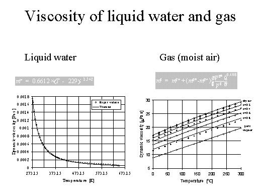 The next is the viscosity of liquid water and gas. You see here on the left hand side the dynamic viscosity of water. Again you see the diagram and above you see the formula which we put into our model. And you see the comparisons of the values given by the formula and the experimental values. |