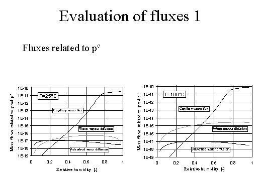 | So with these data we have evaluated some fluxes to see the importance of the respective terms. For instance: fluxes related to gradient of capillary pressure, you see, for instance, for the case of temperature of 25 degrees the capillary water flux is the most important obviously, but you see that the corresponding water vapour diffusion and absorbed water diffusion are rather low. While they get more importance if we go up to 100 degrees centigrade. |