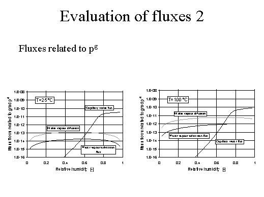 | A similar investigation can also be done for fluxes related gradient of gas pressure and again here you see that at low temperature the capilary water fluxes is important, but already the diffusional fluxes are more important with respect to the capillar flux than in the previous case and for 100 degrees centigrade they are almost of the same magnitude. |