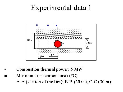 In this case the combustion thermal power was 5 MW which corresponds to passenger car burning, while for instance in the Mount Blanc the fire almost reached 100 MW. And in the experiment they measured the maximum air-temperatures, as you see here, the fire was in the middle in section A than the temperatures have been measured in the section A at 20 meters and at 50 meters. What is also important, during the fire, and immediately after there was a smoke stratum which went from 3,17 meters on, which has been taken into account in our calculation. |
